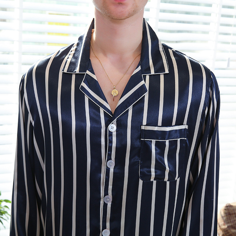 Experience the ultimate in comfort and style with our luxurious Fall men's simulated silk stripe pajamas. Made from high-quality artificial silk, these pajamas provide a soft and smooth feel against your skin, ensuring you enjoy every moment of relaxation.